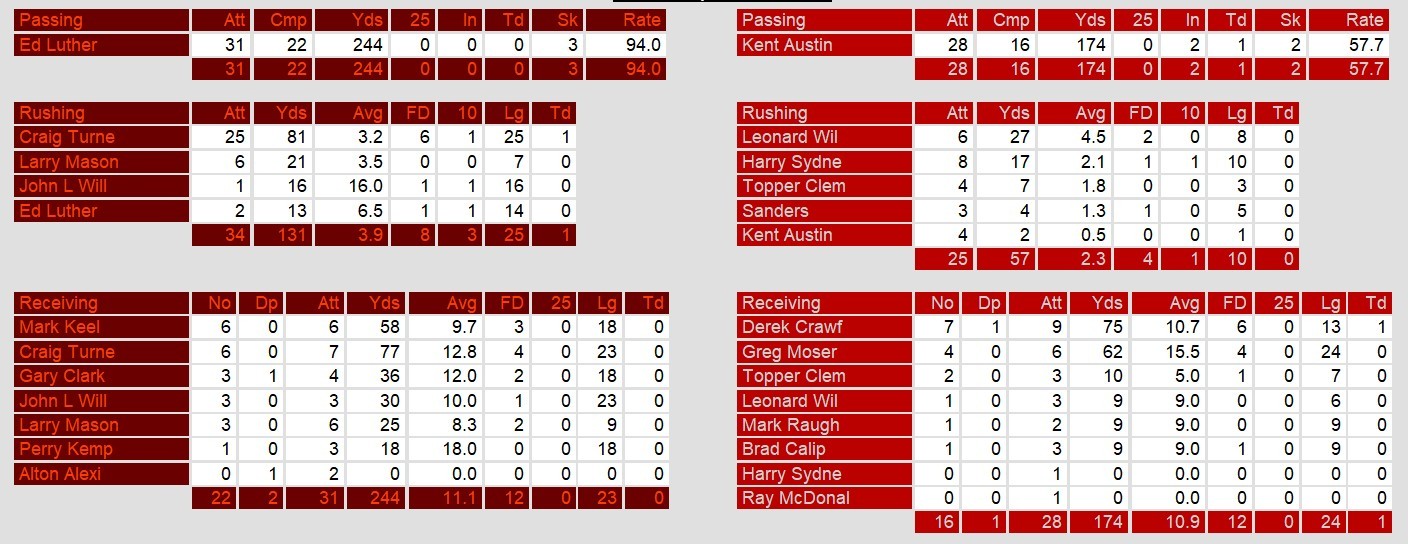 Risher made up for the interceptions somewhat with two touchdown passes. But, the rest of the offense managed only 4 yards per rush, went 3-12 on third down conversions, and took 6 sacks for 42 yards lost. All in all, a dominant performance by Oakland who put the West division on early warning.