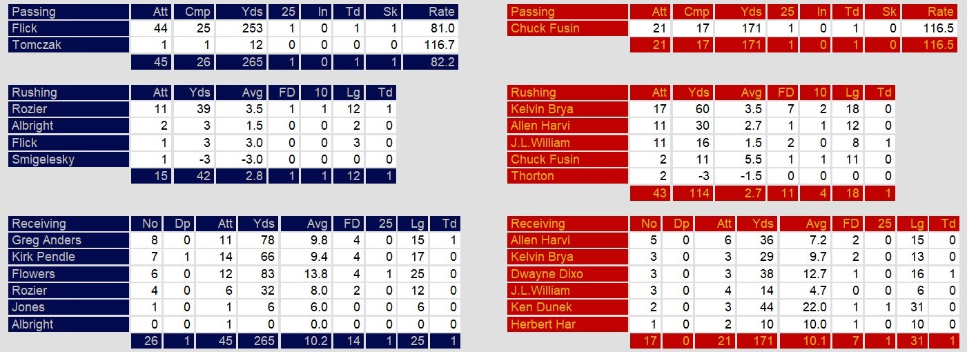 Risher made up for the interceptions somewhat with two touchdown passes. But, the rest of the offense managed only 4 yards per rush, went 3-12 on third down conversions, and took 6 sacks for 42 yards lost. All in all, a dominant performance by Oakland who put the West division on early warning.