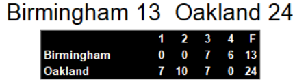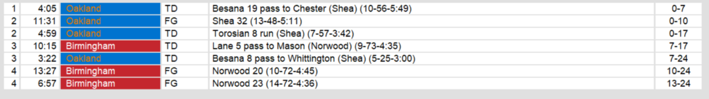 Oakland staked their claim as early season favorites by continuing to roll this week against Birmingham. A touchdown pass by Fred Besana and a run in by Ted Torosian plus a field goal gave them a commanding first half lead of 17-0 that looked insurmountable for Birmingham.