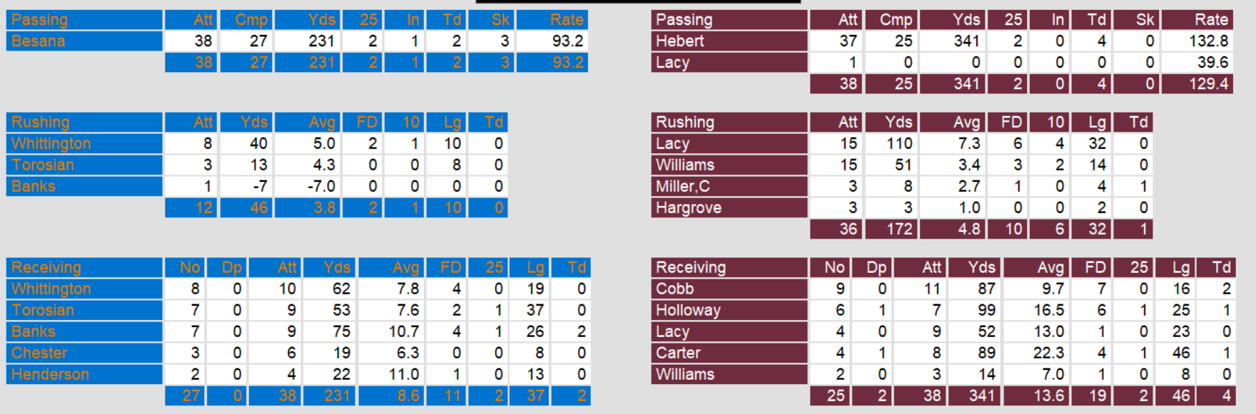 Arizona cut it to 16-6 and looked to take that deficit into halftime before Hebert struck again, this time to Anthony Carter. Michigan piled on with two other touchdowns to put it out of reach. Fred Besana added a garbage time touchdown for the final tally.