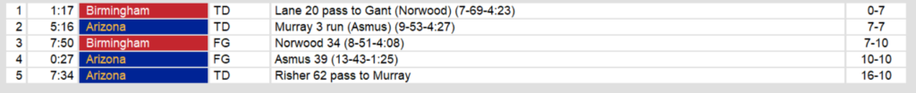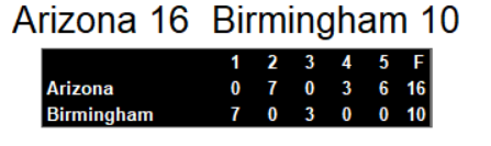 The Arizona Wranglers got their first win of the season, defeating the Birmingham Stallions, 16-10, in the only Saturday game of week 4. Both defenses played well when they needed to. In spite of the offenses gaining over 300 yards each, they held the teams to under twenty points each. Arizona quarterback Alan Risher connected with Calvin Murray for the winning score halfway through the overtime period.