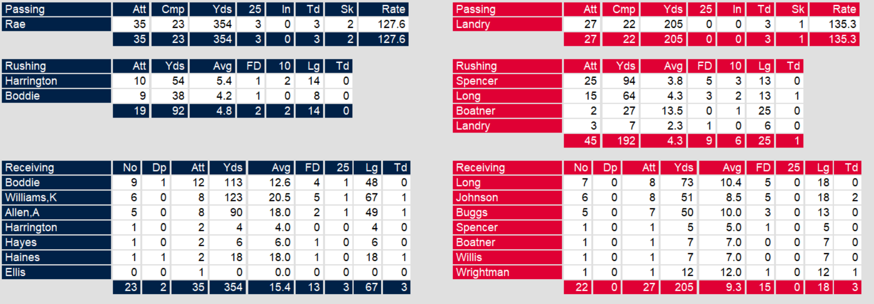 Los Angles fought valiantly to the end, cutting it to 9 with almost 10 minutes left in the game. But, Chicago closed out the game to win in spite of quarterback Mike Rae matching Landry touchdown for touchdown. In spite of the loss, Los Angeles retains sole possession of the division lead.