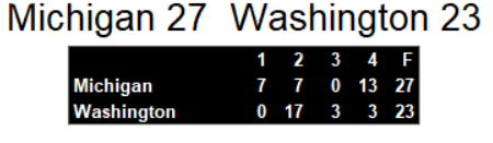 Michigan cut it to two with another run by quarterback Bobby Hebert. Then, running back Ken Lacy finished it off with less than a minute to play with his own touchdown. As a result, Washington is still searching for that first win of the season. But, they have much more hope after this well played game.