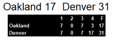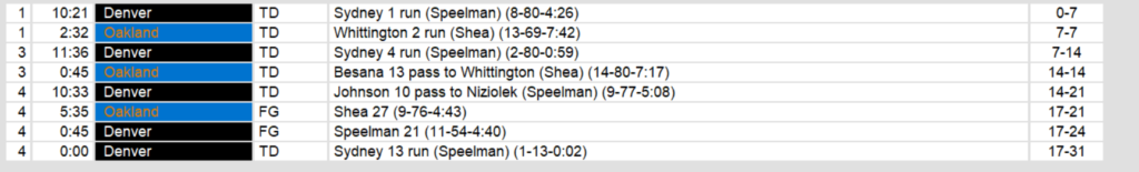 Denver throws a monkey wrench into the west division by defeating division rival Oakland. Previously undefeated and looking like a legitimate contender with Los Angeles, the Invaders had no answer for Denver running back Harry Syndney.