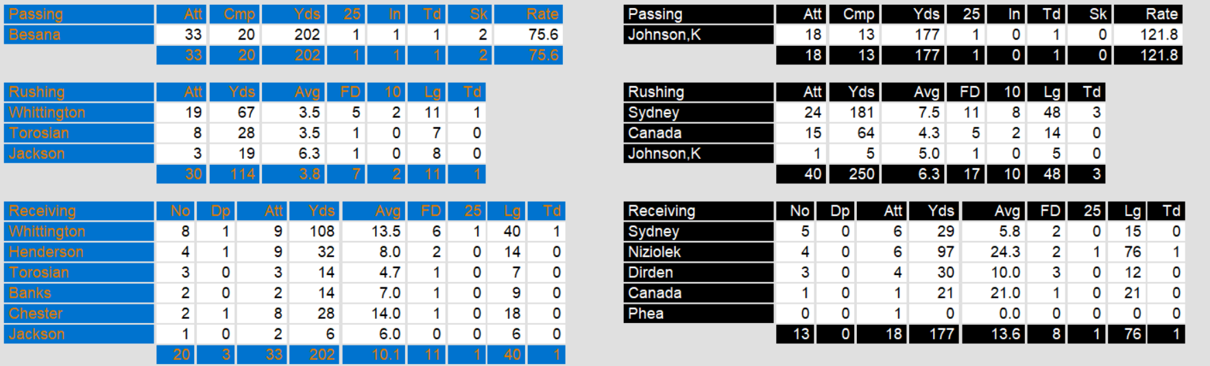 Sydney scored three times on short runs, including the first and last score of the game. On again, off again starting quarterback Ken Johnson also threw a touchdown. The win is Denver’s first of the season and puts them only 2 games behind division leader Los Angeles after their loss to the Blitz.
