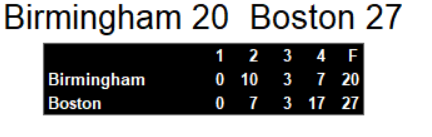 Birmingham lost another close game to drop to 1-4 on the season. Bobby Lane nearly matched Walton but came up one score short in the game. Boston looks to keep winning against Oakland next week while Birmingham has a tough one against division leading Chicago.