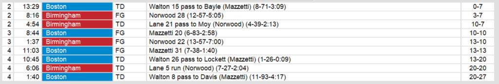 Boston continued to win and stay atop the East Division with a 27-20 victory over Birmingham behind a strong performance by quarterback Johnny Walton. He threw for 367 yards and 3 touchdowns in the game including the game winner with less than 2 minutes left. Kicker Tim Mazzetti added two field goals.