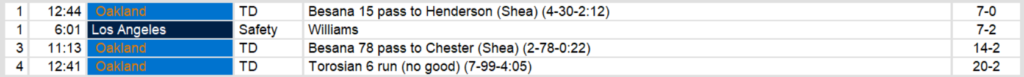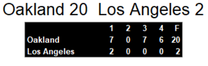 Los Angles played well in the game, amassing over 300 yards of offense but could only manage a safety early in the game as far as scoring. They try again to get back into the win column next week against while Oakland takes on East leading Boston to try to pull ahead in the West.
