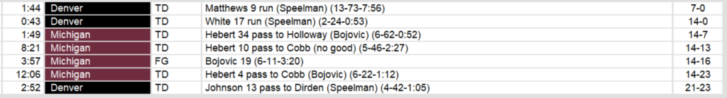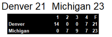 That quarterback, Ken Johnson, threw a touchdown in the closing minutes to cut the deficit to two. Despite another drive in the final two minutes, they turned the ball over on downs and the game ended 23-21. Denver hosts Tampa Bay next week while Michigan takes on New Jersey.