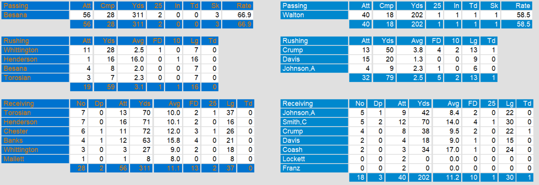 Oakland managed only 3 short field goals by kicker Kevin Shea. Their offense moved the ball well all afternoon, but stalled without reaching the end zone. They host Philadelphia next week. Boston travels to Arizona.