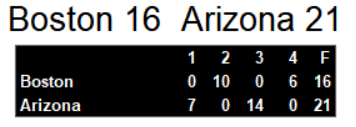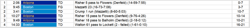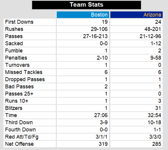 Boston pulled to within 5 with a touchdown pass by John Walton. Boston failed to convert the two point play. Arizona’s defense kept Boston scoreless for the remainder of the gam.e