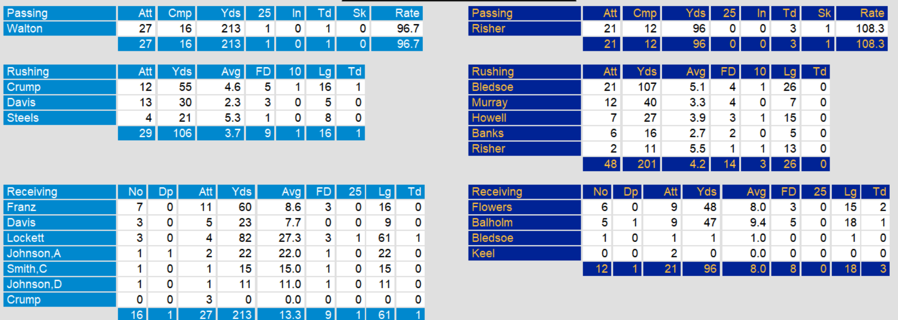 Arizona pulled off a stunner of a win against Boston to start the scheduled Sunday games in week 7. Quarterback Alan Risher threw three touchdowns, two to Jackie Flowers. The win keeps Arizona’s slim division hopes alive.