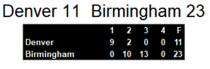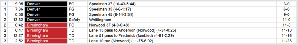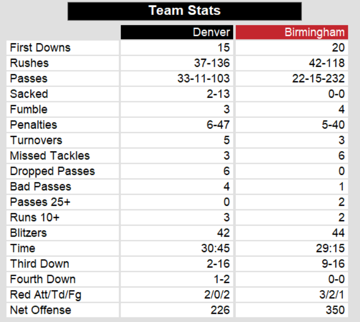 Denver managed less than 250 yards of total offense in the game and showed no signs of life after going up 11-0. They try again next week against Arizona. Birmingham plays Oakland