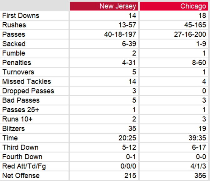 Chicago easily handled New Jersey for their 6th win of the season and to stay only 2 games back of division leading Michigan. The 6-2 record is strong enough to get Chicago the current wild card spot in the playoffs. Behind a season record 8 field goals, the Blitz took care of New Jersey 38-7.