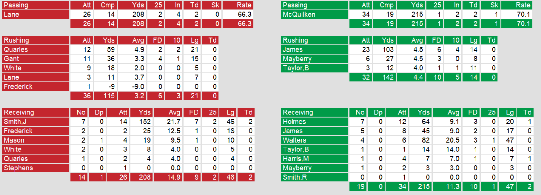 The lead held against two second half touchdown passes by Washington quarterback Kim MCQuilken. The win brings Birmingham to 5-4 and in second place in the tough central division. Washington continues to look for answers as they drop to 2-7.