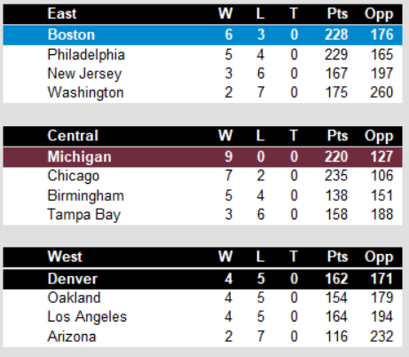 Then on Sunday, Michigan kept winning, this time in impressive fashion over the east division leaders Boston. Birmingham, Chicago, and Denver all won close games, too. Denver’s win put them into a three way tie with Oakland and Los Angeles for the division lead.
