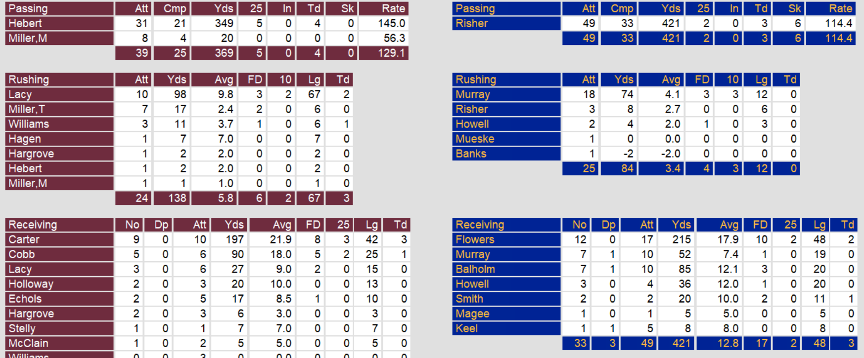Michigan annihilated Arizona Saturday afternoon to remain undefeated. They built a 31-0 lead and never trailed, leading by as much as 41 points in the second half. Quarterback Bobby Hebert threw 4 touchdowns and running back Ken Lacy added two more.