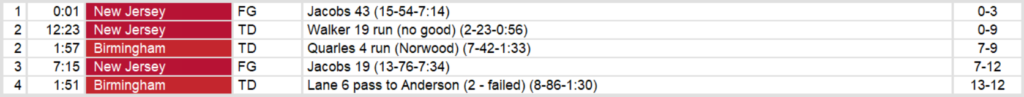 New Jersey fell again, this time to Birmingham at home. In spite of another stellar performance by likely MVP Herschel Walker, the Generals are 3-6 and only saved from the bottom of the east by Washington right now. With a chance to win the game after a late touchdown and missed two point by Birmingham, New Jersey managed only 32 yards and a turnover on downs.