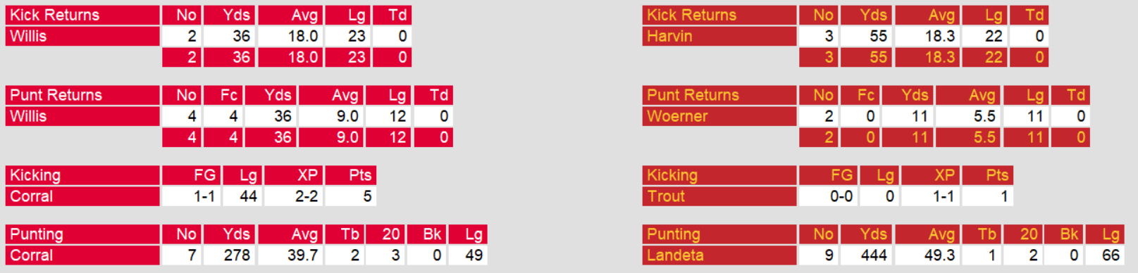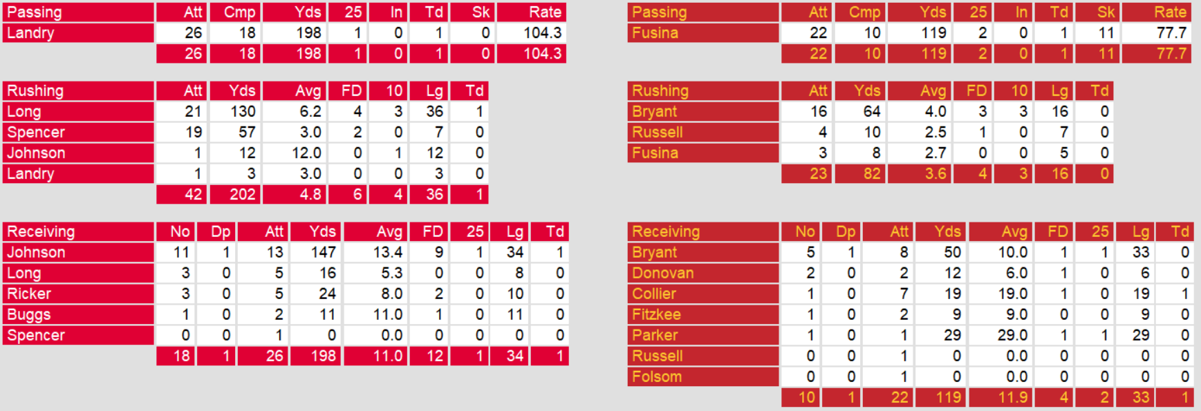 Philadelphia’s offense, averaging over 24 points a game over the last four games ran into a buzz saw in this one. Even though Fusina threw a late touchdown to avoid the shutout, they mustered almost nothing on the offensive side of the ball. The game would have gotten them a game closer to the playoff spot. They get another chance against struggling Arizona in Week 12.