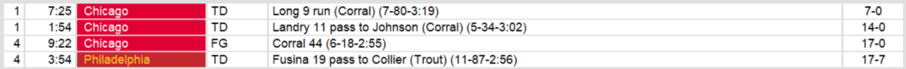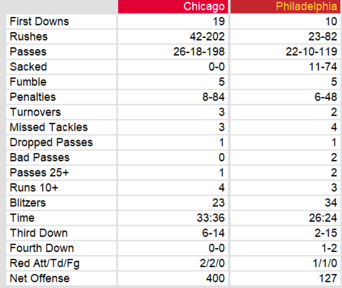 Chicago’s defense carried them to a win over Philadelphia and kept them in the driver’s seat for the wild card playoff spot with 7 weeks left in the season. They allowed only 124 yards of net offense, sacking Philadelphia quarterback Chuck Fusina 11 times for a loss of 74 yards. The offense provided just enough scoring to secure the win. They face New Jersey next week.