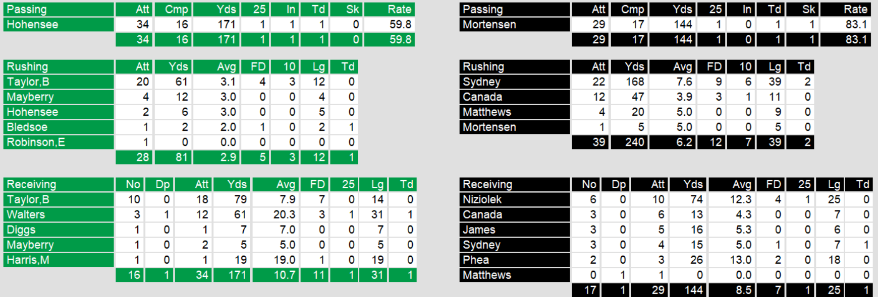 Washington kept it close, leading in the first half. Unfortunately, they let up 18 points in the second half and scored none, leading to the loss. Even so, they seem to have found something with quarterback Mike Hohensee and perhaps they can build something in the last part of the season and next year.
