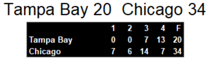 In spite of the Panther’s better record, Chicago again staked a claim to best team in the league. They built up a 21-0 lead before allowing Tampa Bay to score. They they added two more touchdowns to put the game out of reach. Chicago fired on both offense and defense, scoring 3 offensive and 2 defensive touchdowns.