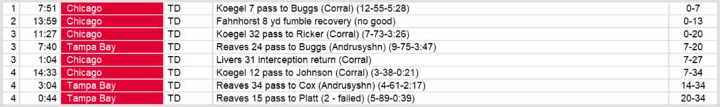 Tampa Bay added two John Reaves passes for a score in garbage time. By that point, Chicago put the game on ice and cruised in for the win. In addition to another pass earlier in the game, Reaves counted for all of the Tampa Bay scoring. The last place Bandits try again for a win next week against Boston.