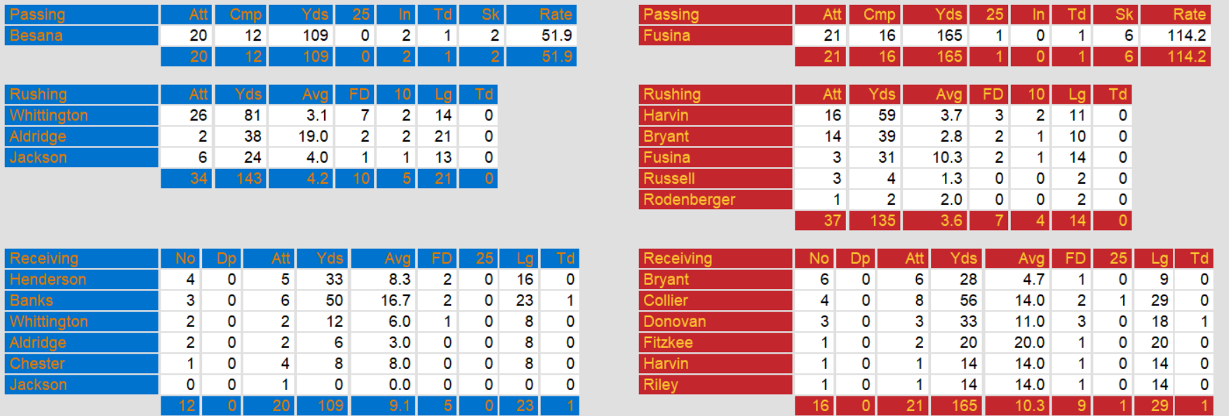 Oakland won a hard fought defensive battle against Philadelphia to wrap up their western division championship and punch their ticket to the playoffs. Their only scoring came, predictably, from a touchdown pass by the surging Chuck Besana. The difference came when their kicker made the extra point after Philadelphia’s kicker missed the extra point.