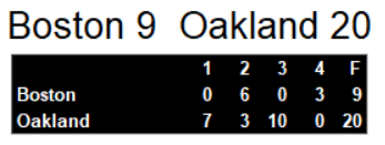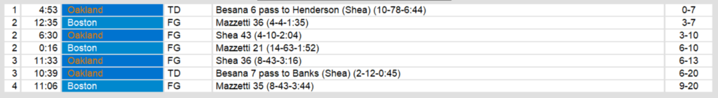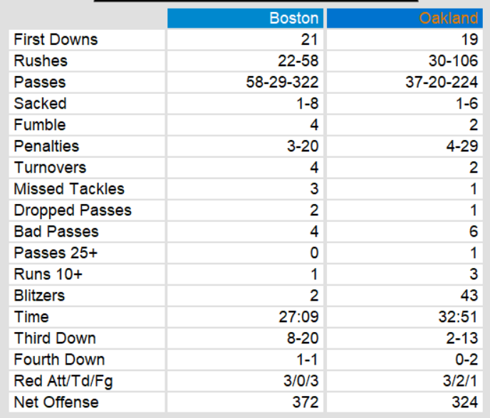 Boston managed only 3 field goals in the important match up. While they have a spot in the playoffs, too, unless they win and Oakland loses next week, they will have to travel to California again in the first round of the playoffs. Against an 8-1 Oakland team at home, that will prove to be a difficult mountain to climb.