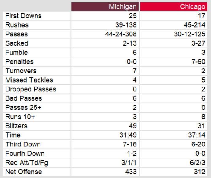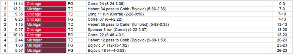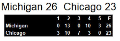 Michigan edged Chicago in overtime on Sunday night. The win put them one game away from an undefeated inagural season. Quarterback Bobby Hebert threw three touchdown passes on the game. Kicker Novo Bojovic kicked a field goal with one minute left and then the game winner in OT.