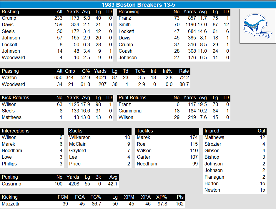 The 1983 Boston Breakers had an impressive season, finishing with a record of 13-5. Coached by Dick Coury, the team showcased a balanced and competitive performance throughout the season, securing victories against formidable opponents. Led by quarterbacks Johnnie Walton and Doug Woodward, the Breakers’ offense demonstrated strength both in the air and on the ground.