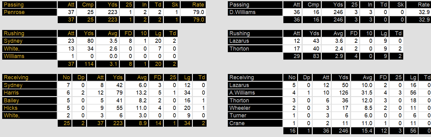 Denver defeated Oklahoma in one of two Saturday games this week. Quarterbak Craig Penrose and running back Harry Sydney both played efficiently, scoring twice in spite of less than stellar yard totals. The Denver defense turned the ball over 4 times.