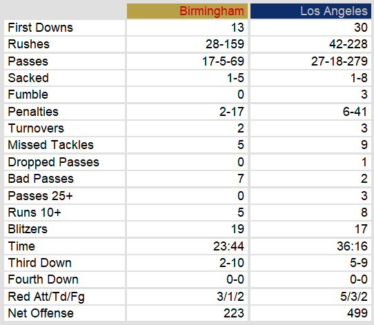 Los Angeles defeated Birmingham at home on Sunday afternoon. Behind a strong performance by quarterback Steve Young, who delivered on a promise. He both threw and ran for a touchdown in the game. In fact, Los Angeles showed a balance in both aspects of their offense, gaining nearly 500 yards on the afternoon.