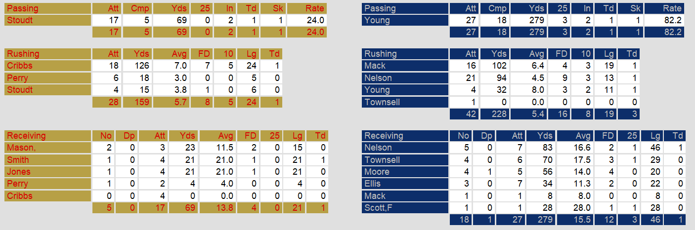 Birmingham fell back to earth after their strong week 1 win. Quarterback Cliff Stoudt completed only 5 of 17 attempts and threw 2 interceptions in the game. Running Back Josh Cribbs added over 100 yards rushing. But, the stunted passing game proved to be their demise.
