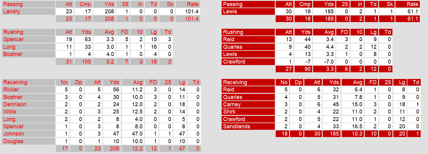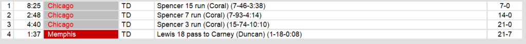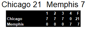 Memphis went scoreless until the last two minutes of the game when they finally managed a single touchdown. Chicago stymied their offense the entire game, holding them to under 300 yards. Then, a fumble in their own red zone gave Memphis the opportunity to score.