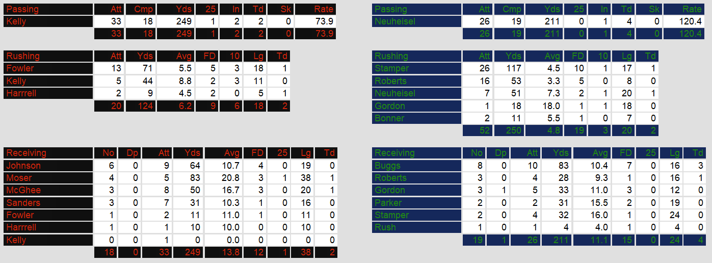 After gaining over 700 yards the previous week, they managed less than 400 this time. Quarterback Jim Kelly threw only two touchdown passes against two interceptions. The run game wasn’t much help, gaining only 130 yards between the three backs that carried the ball.