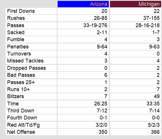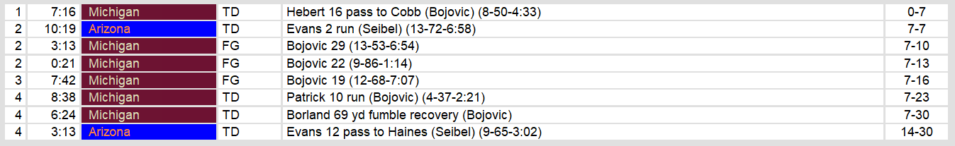 Arizona fell behind early, but tied it at 7-7 in the second quarter. Michigan scored 23 unanswered points. They capitalized on 4 turnovers by Arizona. Arizona quarterback Vince Evans fumbled three times and threw one interception in the game.