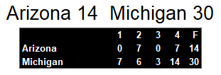 Michigan got back to their winning ways, defeating Arizona at home. They scored on offense and defense and never trailed in the game. Kicker Bojovic added three field goals to round out the scoring.