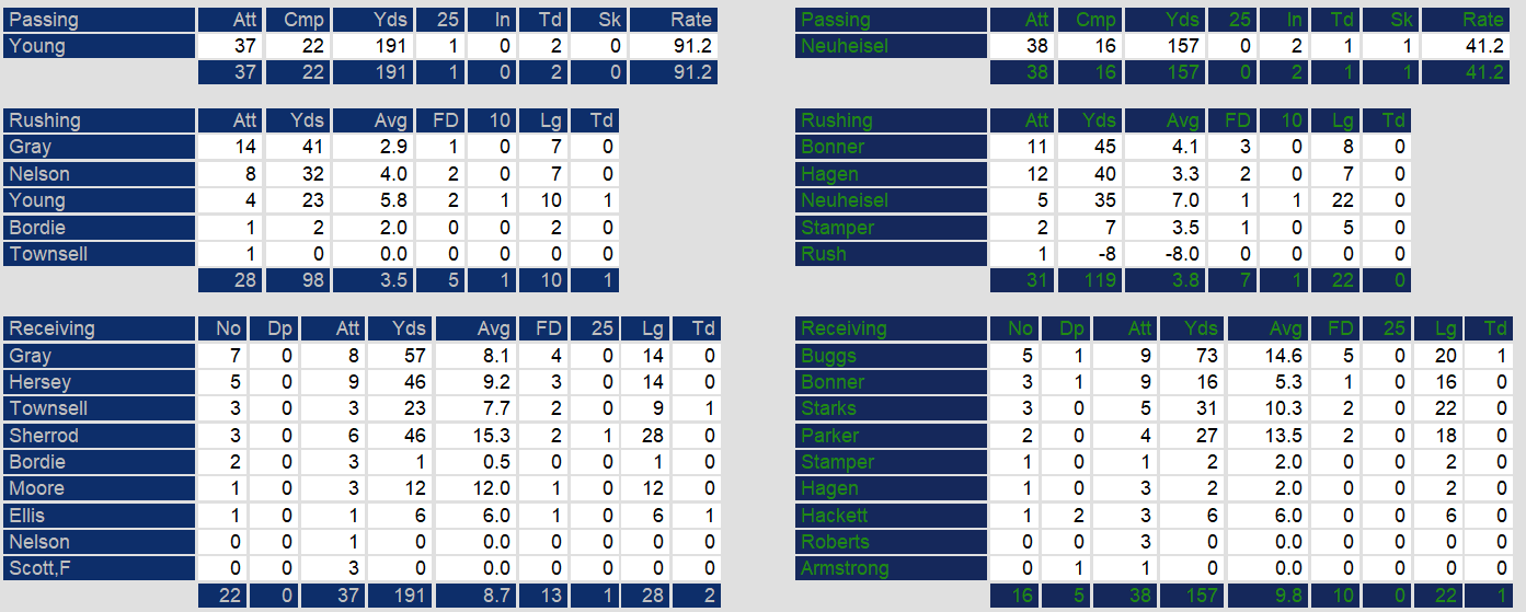 The Gunslingers kept the game close through the first three quarters. But, Young threw those two passes late in the fourth to pull away for the victory. Turnovers sunk San Antonio with 2 interceptions by quarterback Rick Neuheisel.