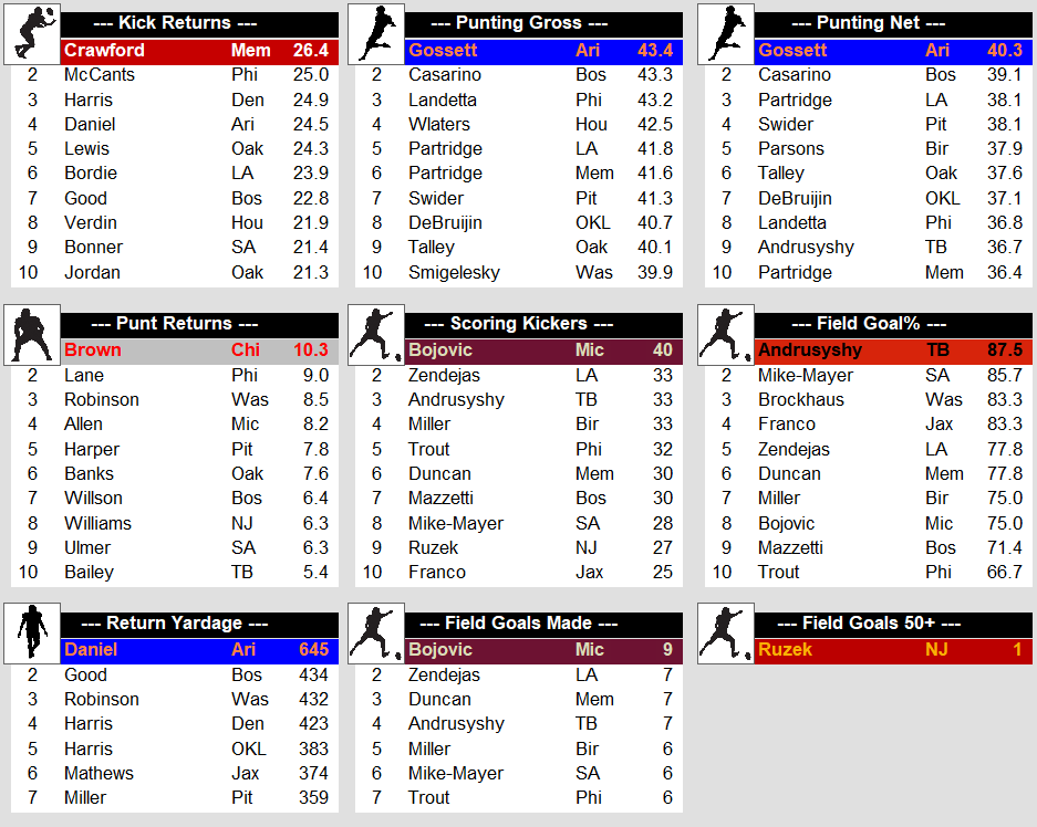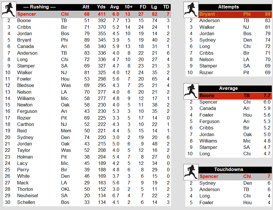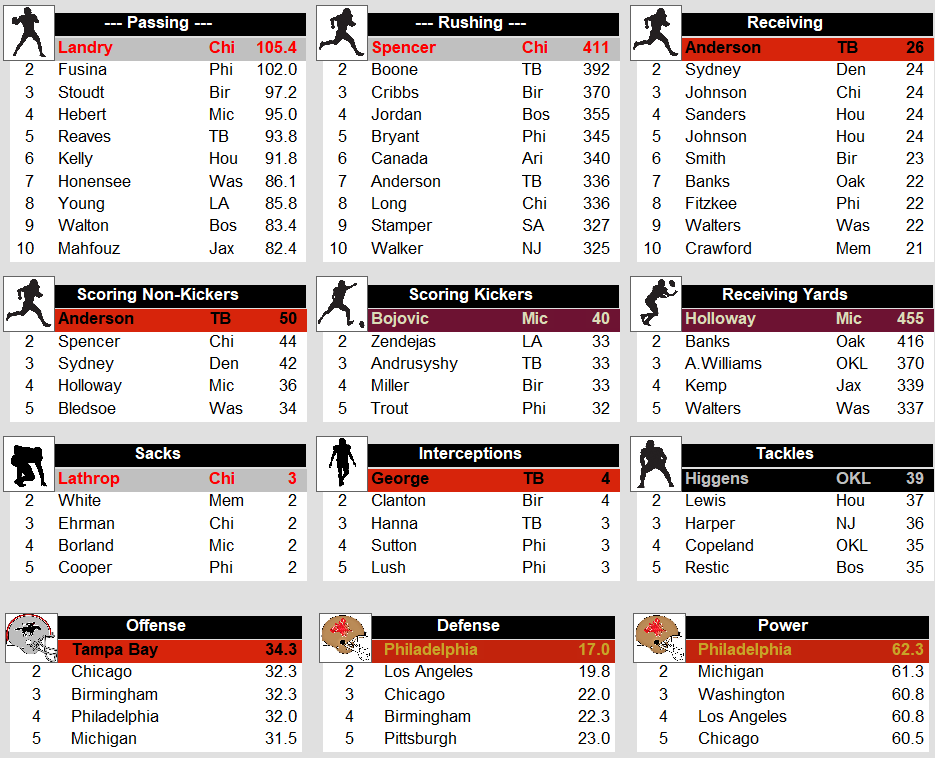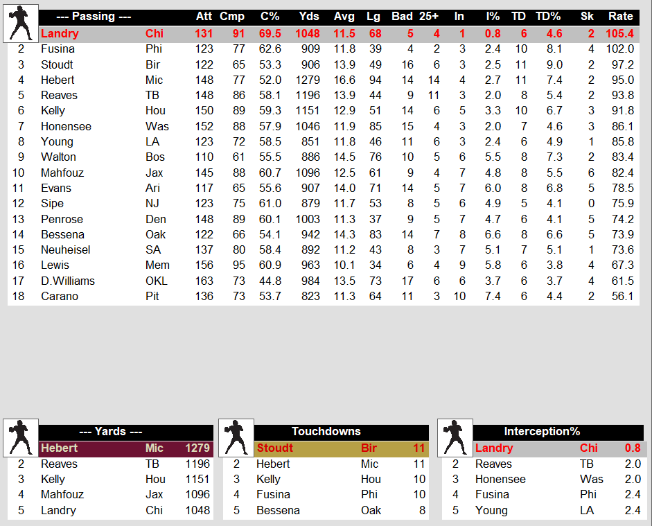 USFL Stat Leaders After Week 4 (1984) Stats Weekly Stats October 21, 2023October 21, 2023 Snapshot Passing Rushing Receiving Defense Special Teams Team Stats
