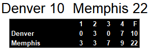 Memphis took care of Denver Sunday afternoon at home. They took a 3-0 lead late in the first and never relinquished control of the game after that. Another field goal, a rushing touchdown and a passing touchdown with a failed two point closed out the scoring.