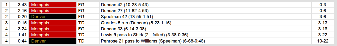 Denver scored only 3 points all game until a pass by Craig Penrose in the final minute gave them their only touchdown of the game. In spite of outgaining Memphis by almost 50 yards, they gave the ball away 6 times. Penrose committed 5 of those turnovers before his touchdown pass.