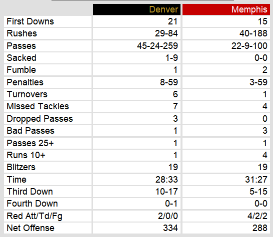 Denver scored only 3 points all game until a pass by Craig Penrose in the final minute gave them their only touchdown of the game. In spite of outgaining Memphis by almost 50 yards, they gave the ball away 6 times. Penrose committed 5 of those turnovers before his touchdown pass.