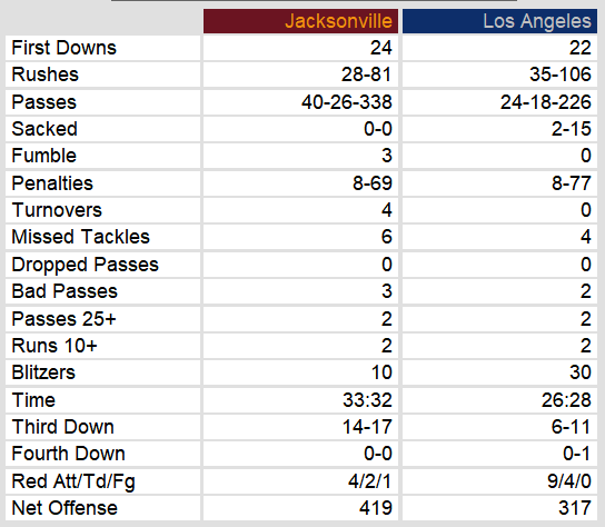 With less than a minute to go and the chance to come back, Jacksonville fumbled the ensuing kickoff. The Express ran out the clock for the win. The fumble was one of four on the game for the Bulls. So, in spite of gaining over 100 yards more offense than LA, they lost the game.