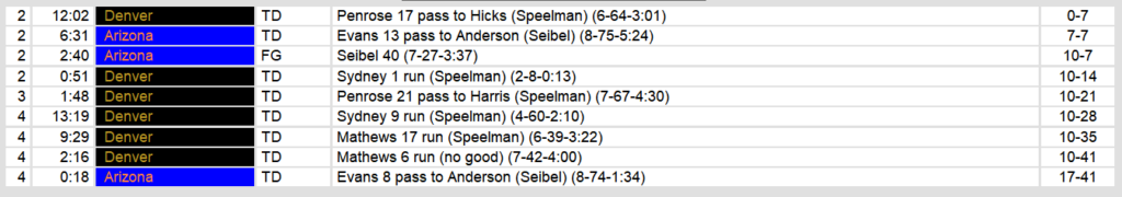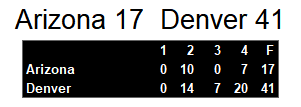 Arizona led late into the first half. Denver then scored 34 unanswered points. Arizona tacked on a late touchdown for the final tally. Denver’s defense proved too strong on this night and held them to only 80 yards rushing in the game.