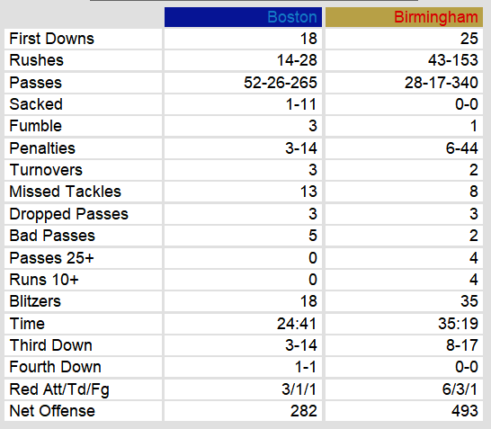 They kept the game close through the first half. Then, Birmingham went on a scoring spree, with 17 unanswered points. Since the running game never got started for Boston, they had to rely on their passing game. Quarterback Johnny Walton put up good yardage, but just couldn’t find the end zone with any consistency.