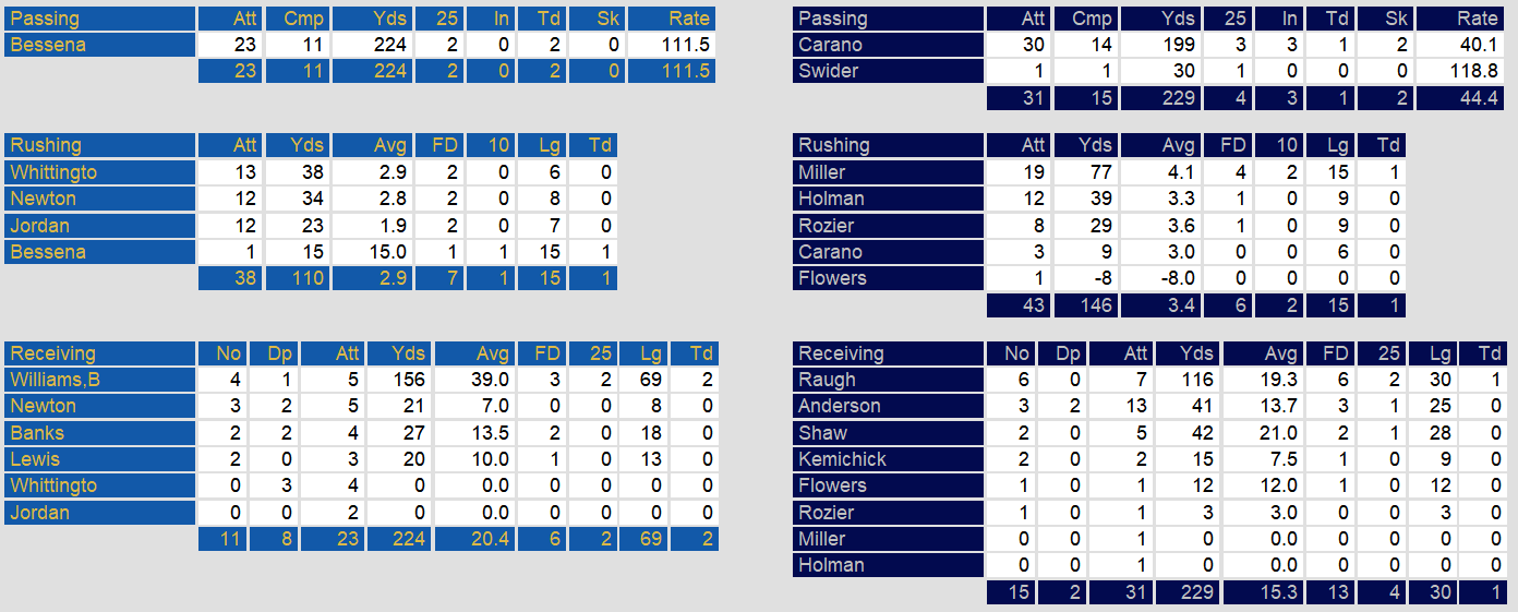 Those three turnovers came at the expense of quarterback Glenn Carano. He threw three interceptions in the game. That gave Oakland the win in spite of Pittsburgh outplaying Oakland in most aspects of the game.