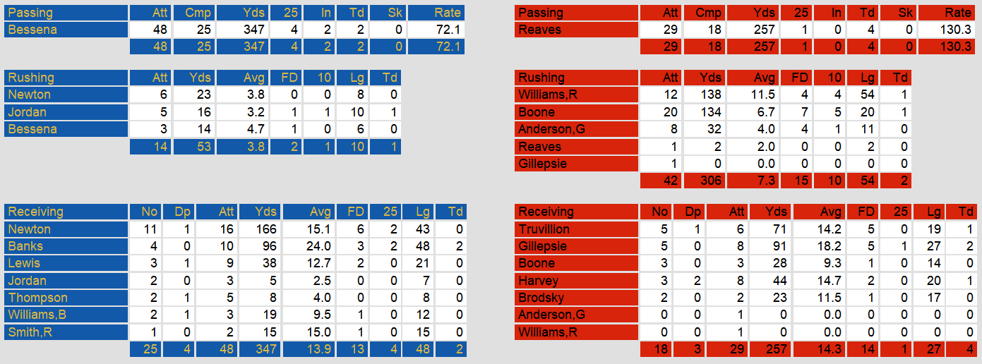 Oakland’s own passer, Fred Besana, thre for two scores. However, Tampa’s offense showed off its new firepower again in this game and buried Oakland’s hopes early. They allowed 563 yards of offense, including 306 rushing yards.