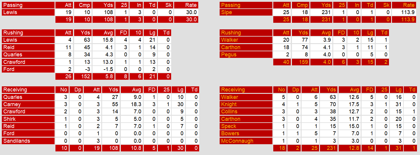 Memphis never got started in the game. They managed only two field goals for their scoring. Three of their four turnovers were interceptions. Their quarterback Lewis managed just over 100 yards passing thanks to a smothering New Jersey defense.