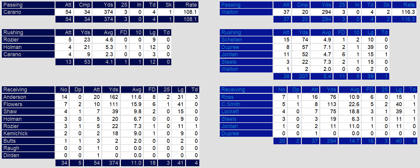 Pittsburgh quarterback Greg Carano led a furious comeback in the fourth with 2 of those touchdowns. The defense added a fumble recovery touchdown as well. The Maulers failed to recover the ensuing onside kick and Boston ran out the clock for the 3 point win.